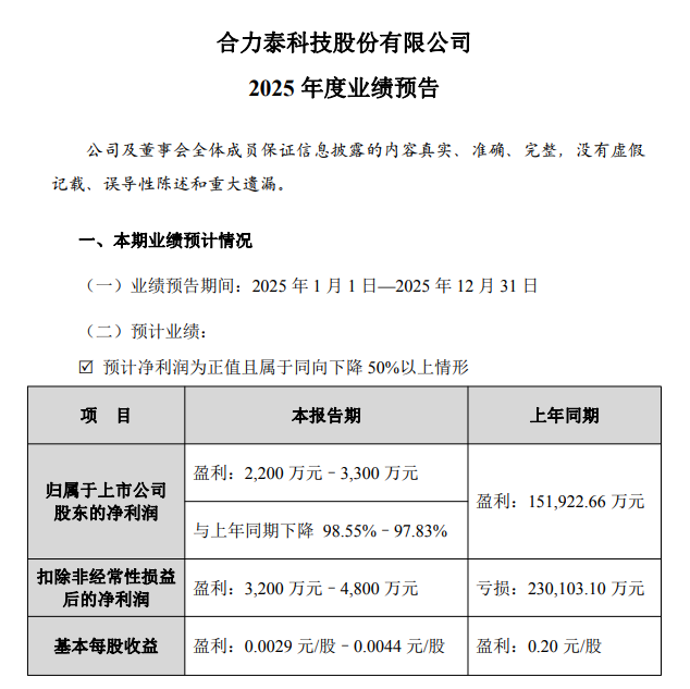 1月21日牛博士,合力泰发布2025年度业绩预告,公告显示,合力泰预计2025年归母净利润为2200万元–3300万元,同比下降98.55%–97.83%。